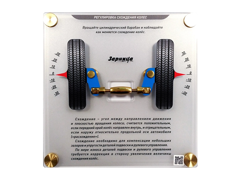 Модель предназначена для наглядной демонстрации угла схождения колес автомобиля при регулировке длины рулевой тяги.