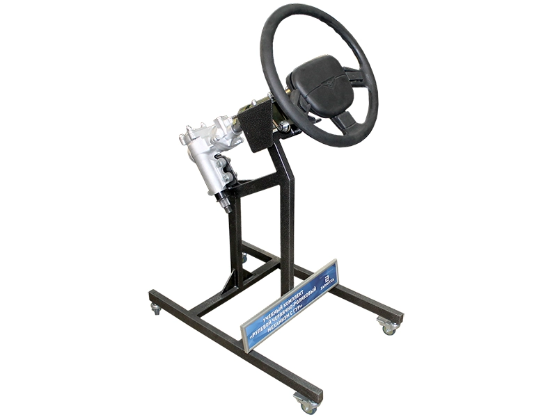 Учебный стенд комплекта представляет собой напольную конструкцию с установленным на ней рулевым механизмом. Рулевой механизм подготовлен для многократной сборки-разборки. Реализована возможность вращения элемента рулевой системы.