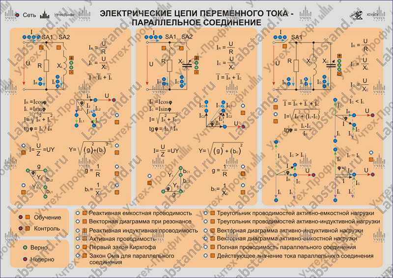 – планшет светодинамический, содержащий: элементы управления; схему замещения, векторные диаграммы, треугольники проводимостей и основные формулы параллельного соединения RL-цепи; схему замещения, векторные диаграммы, треугольники проводимостей и основные формулы параллельного соединения RС-цепи; схему замещения, векторные диаграммы, треугольники проводимостей и основные формулы параллельного соединения RLС-цепи; контрольные вопросы (не менее 12 шт.).