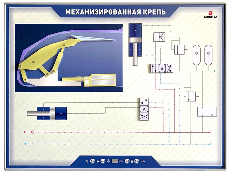 Стенд представляет собой жёсткое основание с цветным изображением принципиальной гидравлической схемы и общего вида механизированной крепи. Для наглядной иллюстрации принципа действия установлены светодиоды и подвижные макеты основных органов управления и исполнительных механизмов.