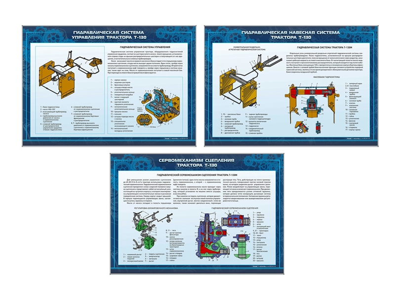 Комплект стендов «Гидросистемы тракторов» представляет собой комплект информационных панелей, на которых размещены рисунки, схемы, таблицы, графики и формулы по курсу "Устройство автотракторной техники".