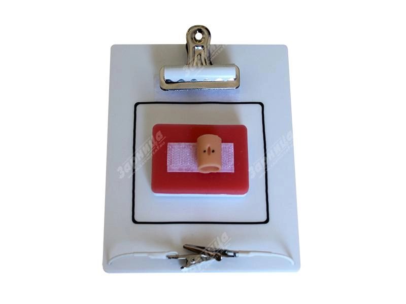 Тренажер представляет собой дренаж с имитацией раны. С помощью двух иглодержателей накладывается узел в области маркированных зон вкола и выкола.