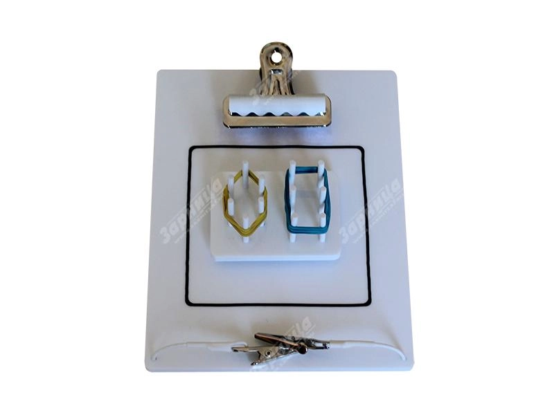 Упражнение представляет собой основание с поперечными штырьками, на которые натянуты 2 резиновые нити. С помощью клипатора эти нити соединяются между собой, а затем иссекаются в другом месте – посередине между наложенными клипсами. Таким образом получается единое кольцо.