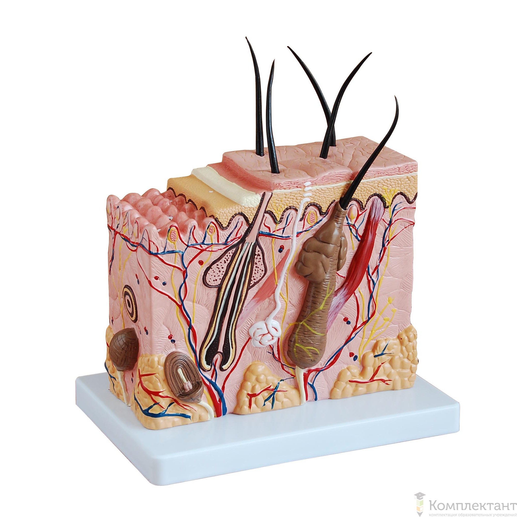 Модель кожи человека, выполненная в масштабе больше натурального (масштаб 70:1). На модели показаны слои кожи и их структуры, волосяные фолликулы, потовые железы, сальные железы, чувствительные тельца, нервы, кровеносные сосуды