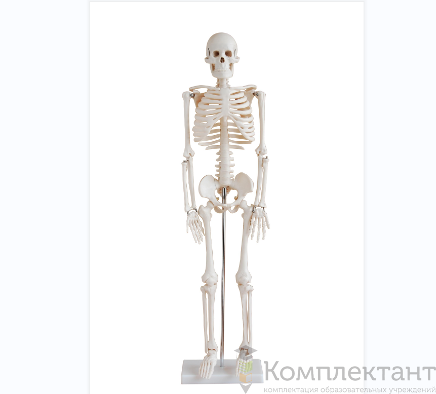 Модель представляет собой скелета взрослого мужчины 80 см. (с подставкой 85см). Подъязычная кость и ушные косточки не показаны. Суставы верхних и нижних конечностей выполнены подвижными.
