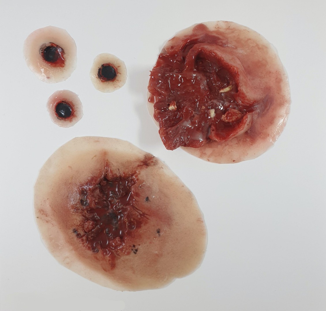 - Данный комплект воспроизводит внешний вид входных и выходных отверстий огнестрельных ран