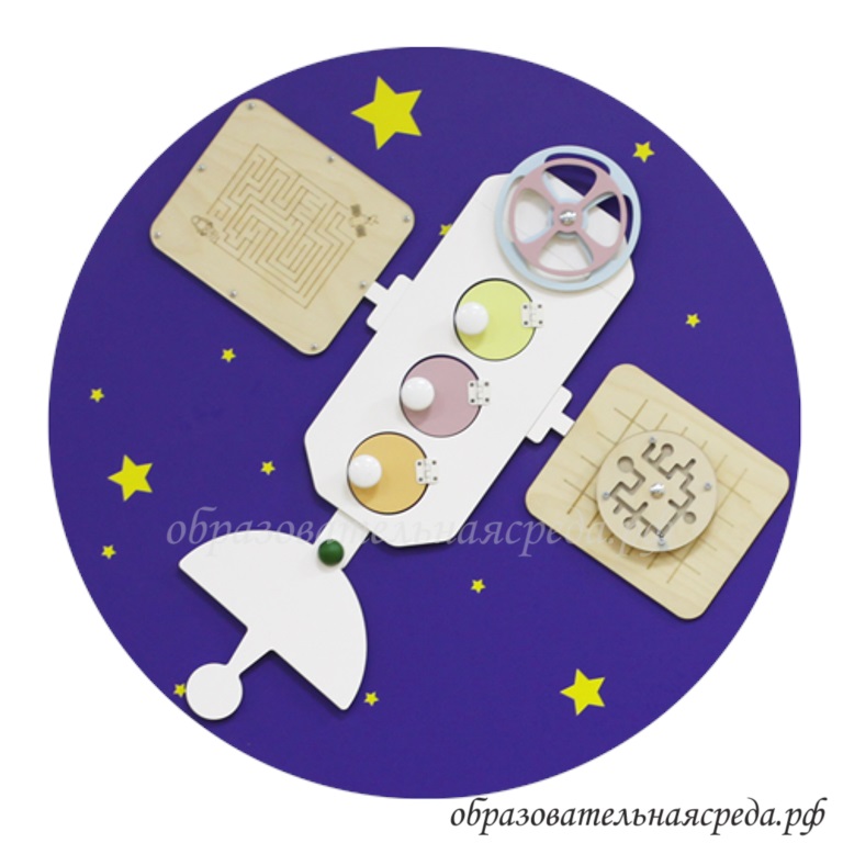 Бизиборд в космической тематике подходит для проведения занятий по развитию речи, познавательного интереса и мелкой моторики.