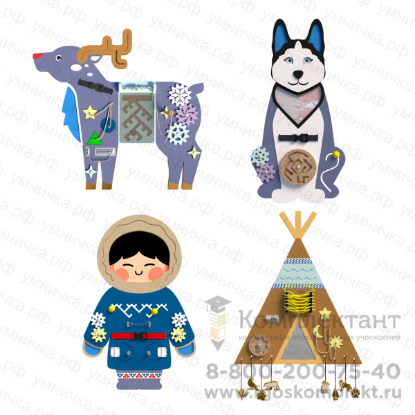 Набор «Северная сказка» включает 4 бизиборда: «Ездовая собака», «Чум», «Олень», «Северный мальчик»