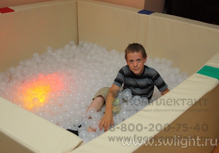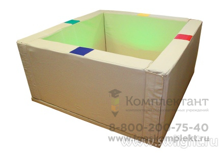 Каркас сухого бассейна изготовлен из высококачественной фанеры толщиной 9 мм, обшитой поролоном. Материал стенок: ПВХ. Для выбора цвета подсветки сухого бассейна в стенки вмонтированы кнопки черырех цветов, также система подсветки содержит электронное устройство управления, позволяющее автоматически переключать цвета подсветки без кнопок.