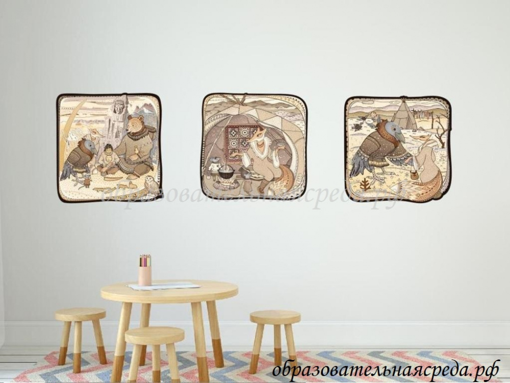 Настенная композиция "Этнические панно" выполнены по мотивам сказок народов севера. Комплект состоит из трех различных панно фигурной формы.