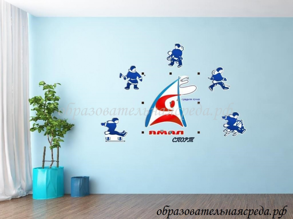 Настенная композиция "Ямал спорт" состоит из восьми отдельных элементов, которые можно использовать для декорирования корридоров ДОУ или спортивных залов. Размер центральной эмблемы 0,6*0,6м.