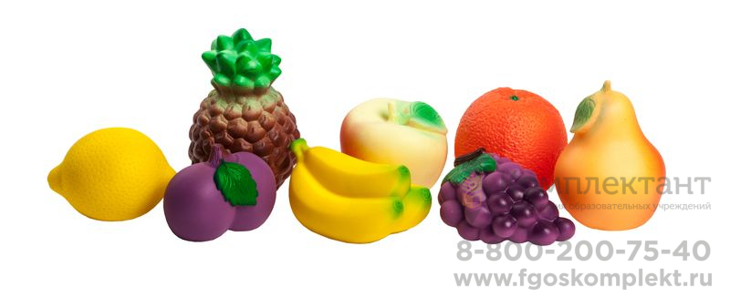В комплекте: яблоко, апельсин, вишня, слива, клубника, арбуз, виноград, ананас, лимон – все по 1шт