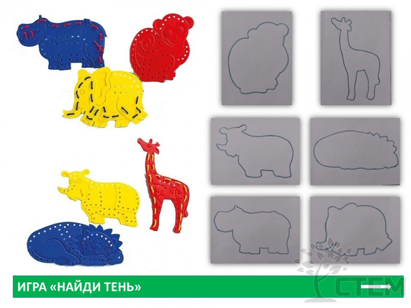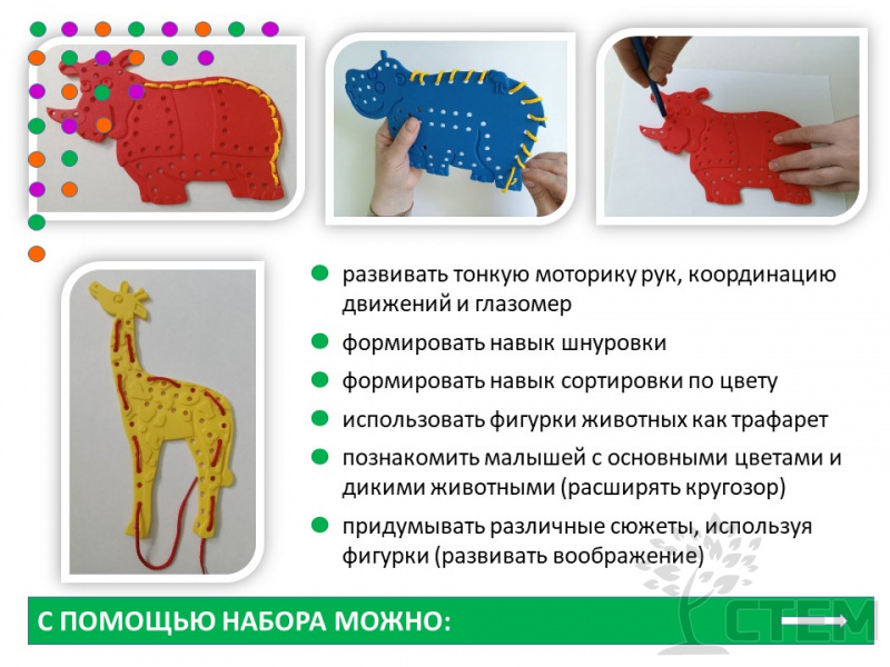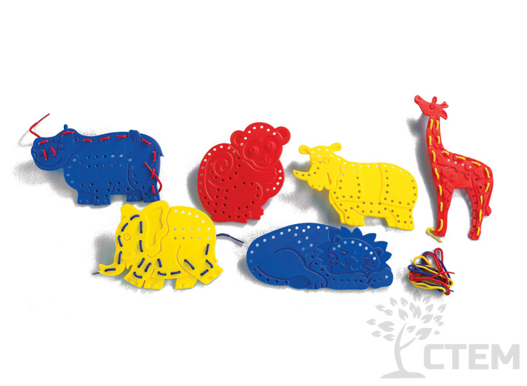 6 диких животных: бегемот, обезьяна, носорог, жираф, слон и лев, 3 цвета, 18 шнурков.