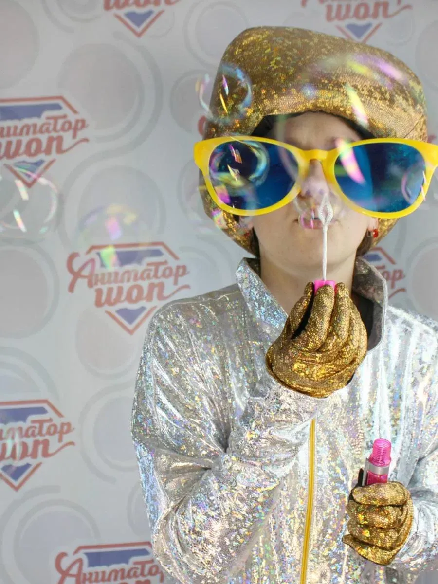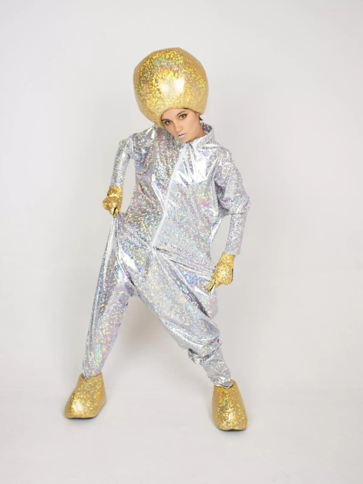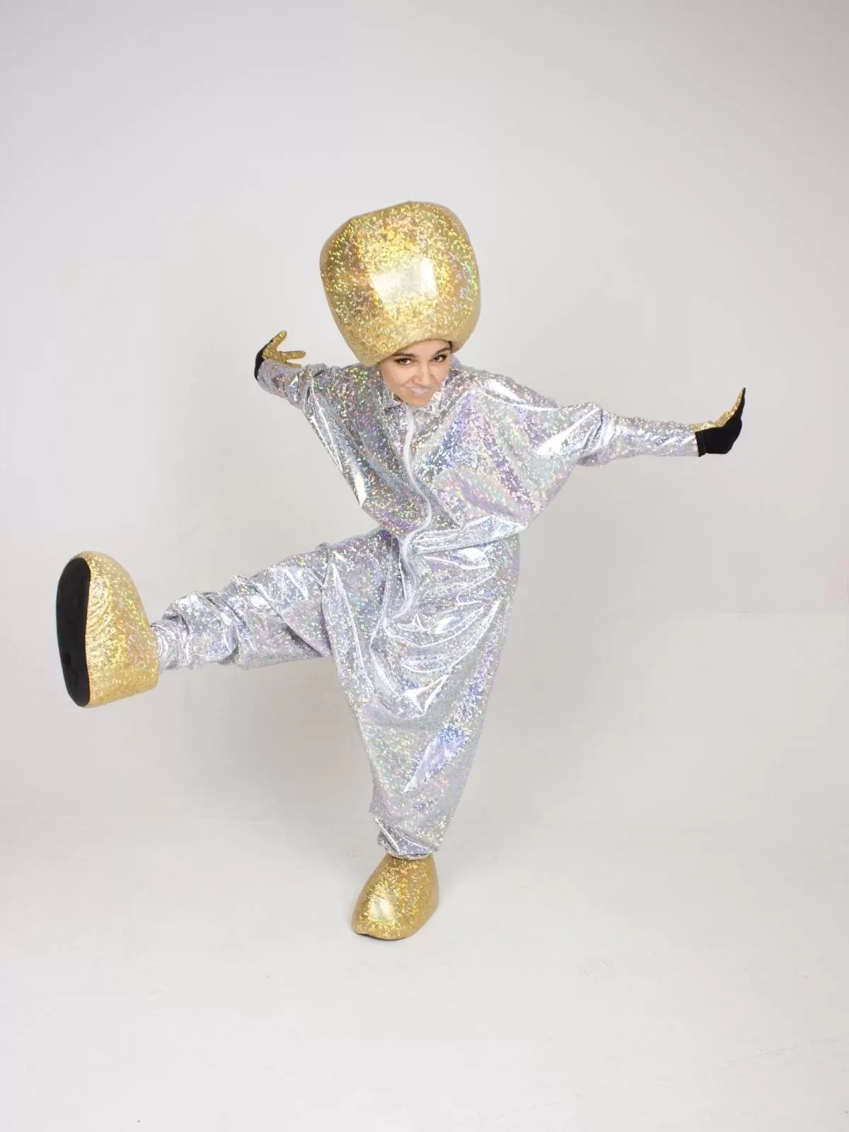 Костюм Слайм выполнен из яркой голограммы золотого и серебряного цвета, переливающейся на свету, как мыльный пузырь или диско-шар.