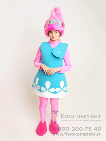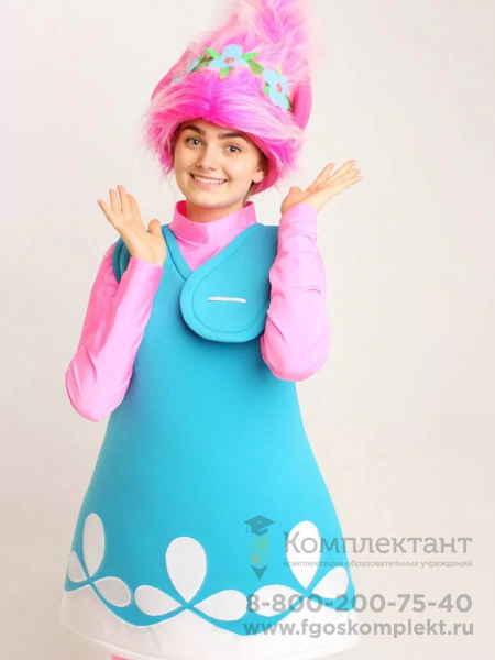 Розочка – тролль, дочь бесстрашного отца, Розового короля, ее сердце наполнено смелостью, уверенностью, оптимизмом. Она настолько очаровательна и мила, что влюбляет в себя с первых минут появления. Костюм Тролля Розочка полностью отражает мультипликационный персонаж. На выбор предоставляется 2 варианта головного убора – мехом вниз и мехом наверх.