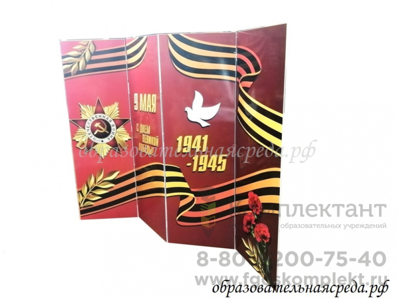 Напольная ширма гармошка "День победы" поможет познакомить воспитанников с праздником Великой победы, украсит музыкальный зал или поможет создать мемориал памяти в детском саду. Знакомя детей с праздником 9 мая мы воспитываем чувство гордости за тех, кому мы обязаны мирным небом; воспитываем уважение к защитникам своей Родины и желание её защищать в будущем.