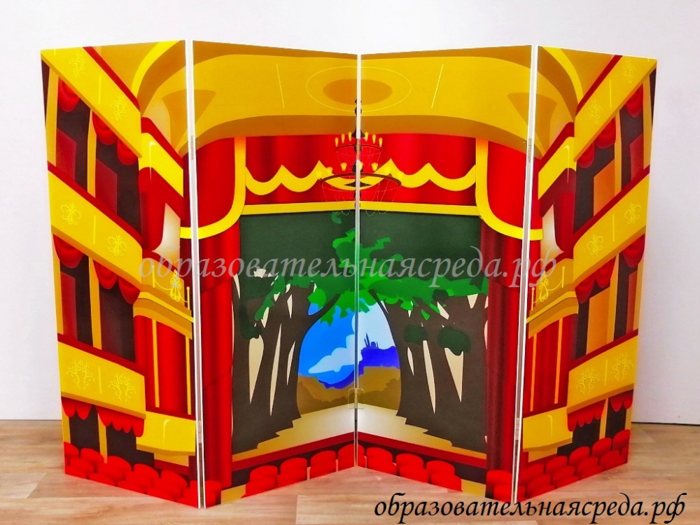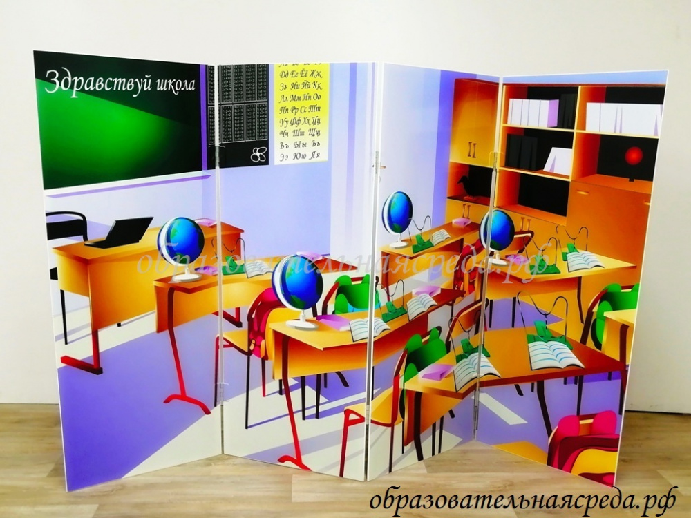 Напольная ширма гармошка "Школа-театр" выполнена из МДФ с нанесением полноцветного рисунка с двух сторон ширмы. С одной стороны ширмы изображена школа, с другой сцена театра. Ширма состоит из четырех створок, скрепленных между собой на петлях. Для удобства в эксплуатации ширма складывается гармошкой и при хранении занимает мало места.