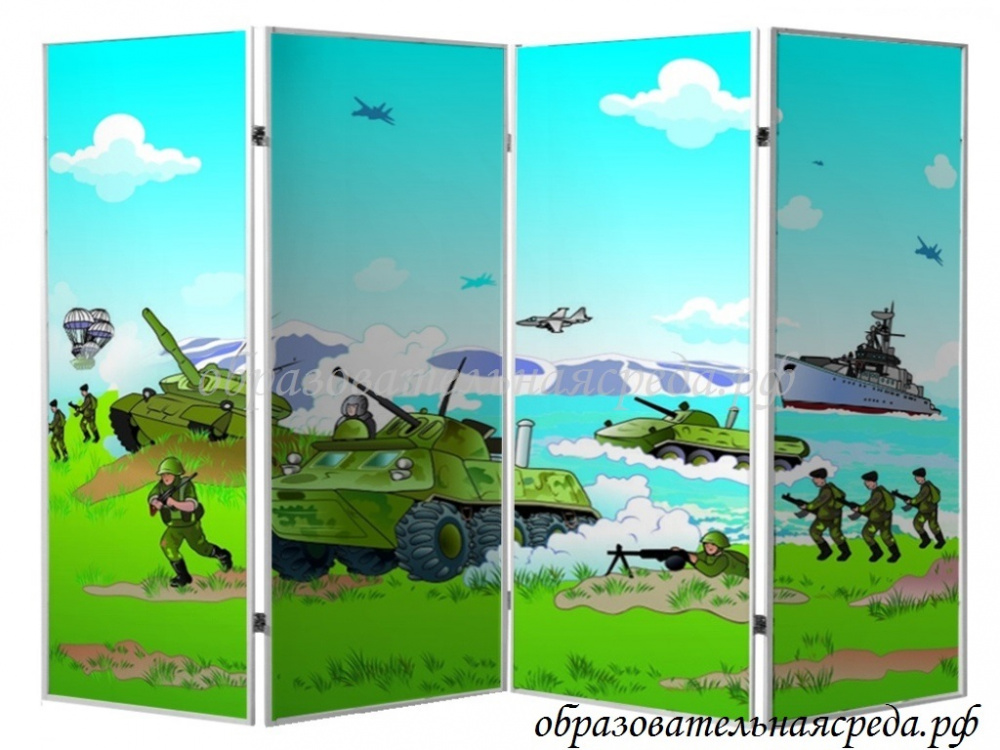 Напольная ширма гармошка "Военные" поможет познакомить воспитанников с военным делом или же послужит фоном для праздников на военную тематику. Она состоит из четырех створок, которые компактно складываются гармошкой. Высота ширмы 1,25м, ширина одной створки 0,5м.