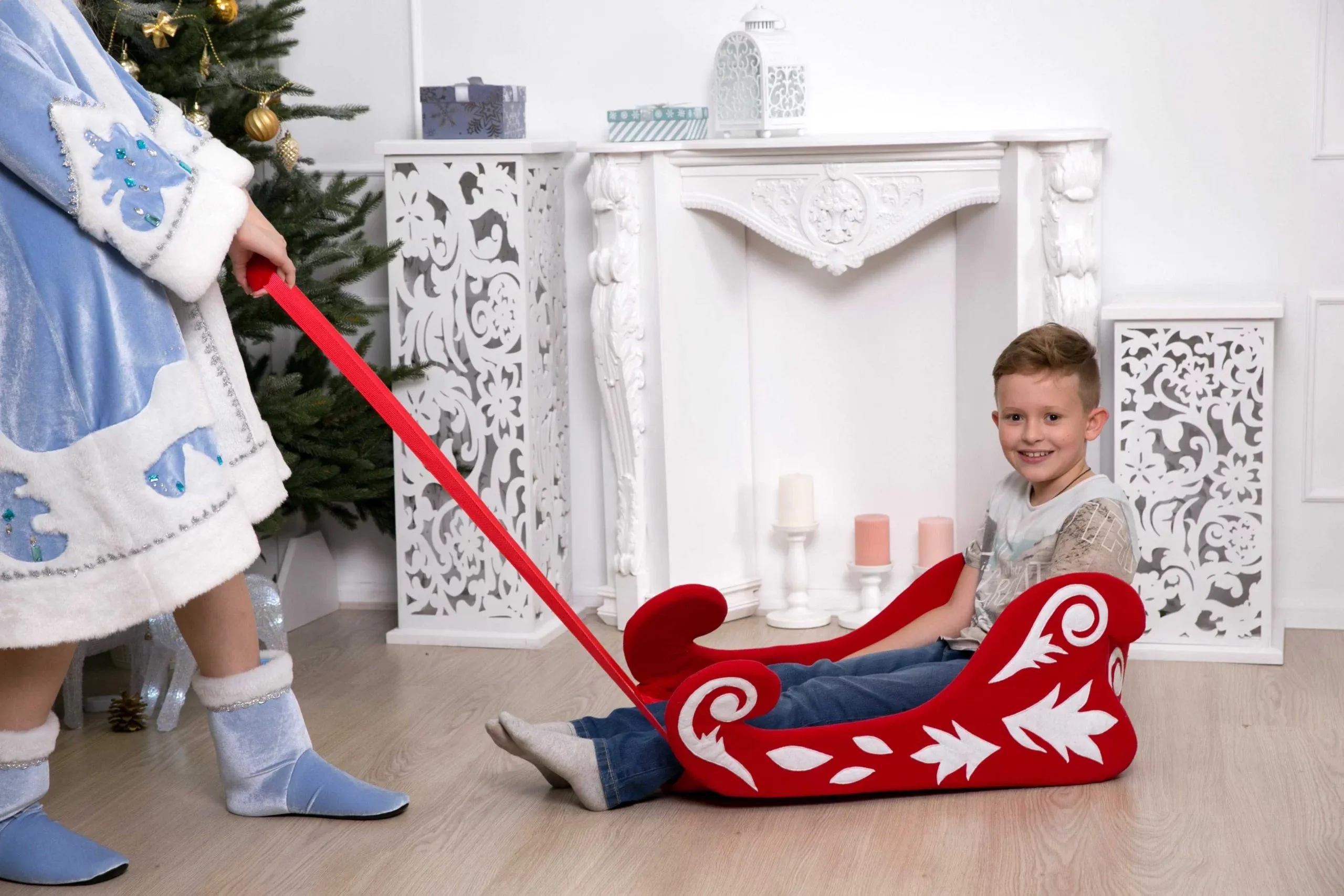 Так же возможно заказать реквизит в голубом цвете и устраивать гонки на санях Деда Мороза и Снегурочки.