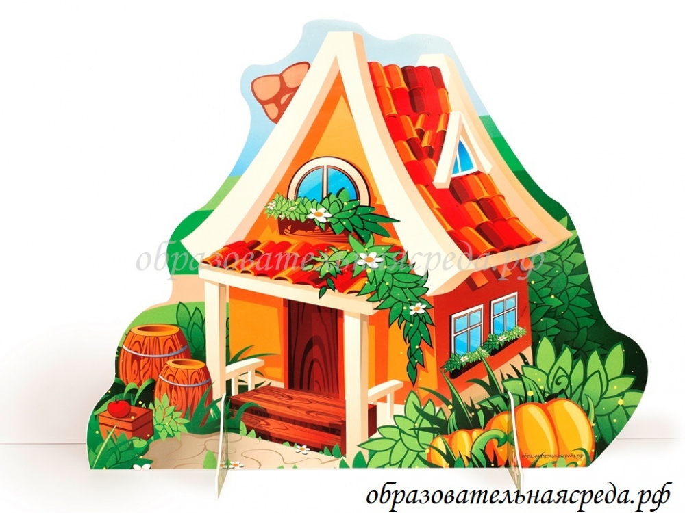 Театральная декорация "Домик с черепичной крышей" (лето-зима) выполнена из МДФ, с нанесением полноцветного рисунка с двух сторон. Высота декорации 1,2м, ширина - 1,5м.