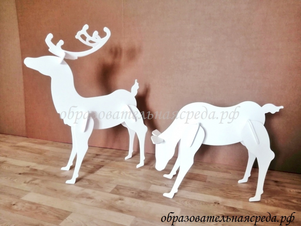 Новогодняя композиция "Лесная сказка" выполнена из МДФ, и окрашенного в белый цвет. Композиция состоит из трех элементов: дерево, олень, олениха. Высота дерева 1,2м, ширина - 1м, высота оленя 0,7м, оленихи - 0,4м. Дерево имеет красивую резную форму с завитками. Композиция порадует детишек не только в новогодние праздники, но и в повседневной жизни. Дерево можно украшать различными тематическими элементами, например гирляндми.