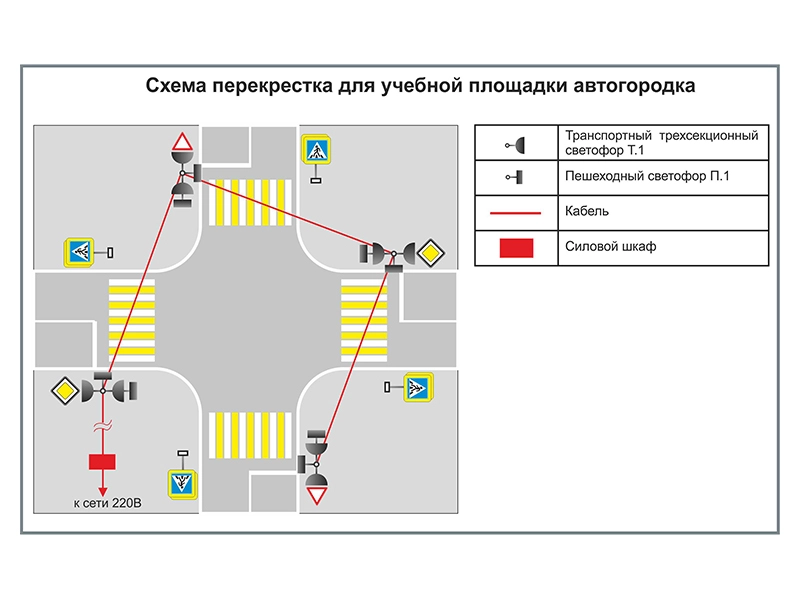 Учебные площадки со стационарным оборудованием предназначены для обучения учащихся дошкольных и школьных общеобразовательных учреждений навыкам безопасного поведения на дорогах, с использованием методических рекомендаций по изучению правил дорожного движения. Учебная площадка располагается на асфальтированной поверхности площадью от 100 м2 и оборудуется электрифицированными светофорами. Возможна установка нескольких учебных площадок (перекрестков) на одной территории с их объединением в общую дорожную инфраструктуру. Оборудование учебной площадки (светофоры, дорожные знаки) устанавливается на бетонированные фундаменты, а электропитание светофоров осуществляется от стационарного источника.