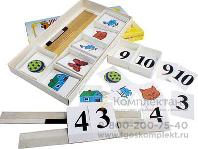 Учебное пособие представляет собой набор карточек с цифрами от 1 до 10 и пяти видов фигурок разного цвета. В состав пособия входят также и три пластмассовых кармана с магнитами для установки в них карточек. Карточки и карманы уложены в коробку.