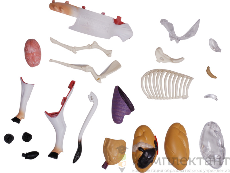 Конструкция модели включает прозрачные элементы, позволяющие наблюдать расположение внутренних органов и костной структуры без необходимости разборки. Все 29 деталей являются полностью съемными, что обеспечивает поэлементное изучение анатомических систем коровы. Особое внимание уделено точному воспроизведению пищеварительной системы жвачных животных, имеющей сложное многокамерное строение. Модель отличается высокой детализацией и реалистичностью исполнения благодаря ручной росписи элементов.