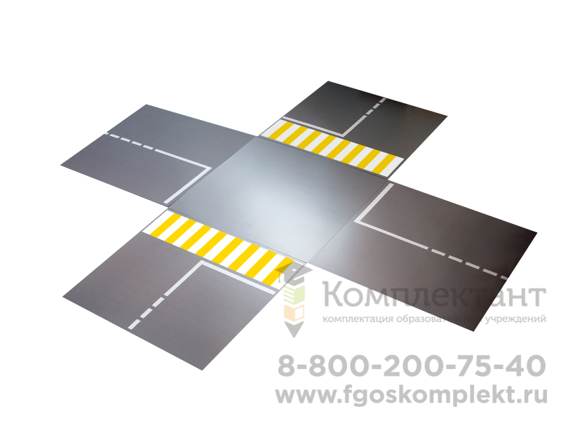 Четырехсторонний перекресток представляет собой демонстрационную модель перекрестка, состоящую из пяти секций, на которых изображена проезжая часть с линиями дорожной разметки и пешеходными переходами.