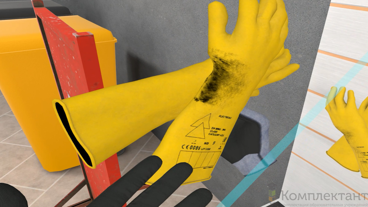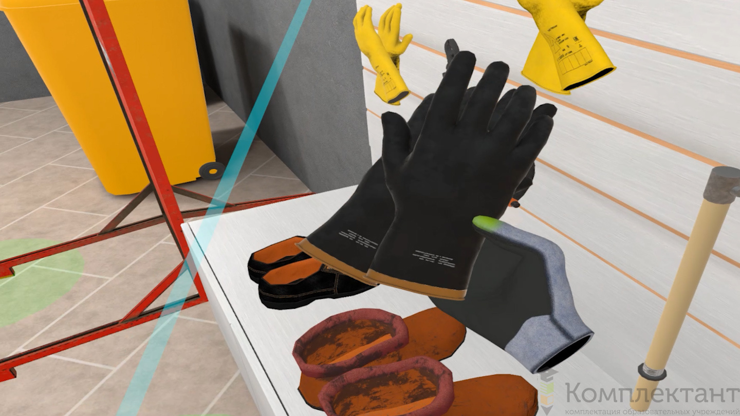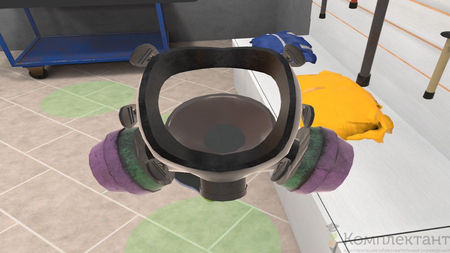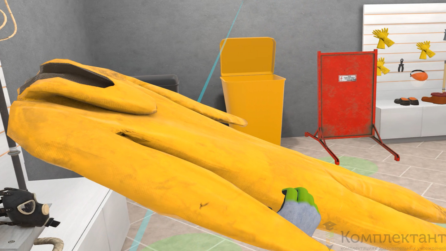 Виртуальный (VR) тренажер «Средства индивидуальной защиты» воссоздает ситуацию, в которой пользователю необходимо осуществить проверку основных СИЗ, отказ от поврежденных, понимать процесс проверки, разделить СИЗ на те, которые находятся на пользователе сейчас, и те, которые следует принести на рабочее место. СИЗ - это средства, которые нейтрализуют воздействия опасностей, вызывающие серьезные травмы и заболевания на рабочем месте. В рамках тренажера пользователю предоставляется выбор работ: химические и электрические, СИЗ меняются в зависимости от выбора.