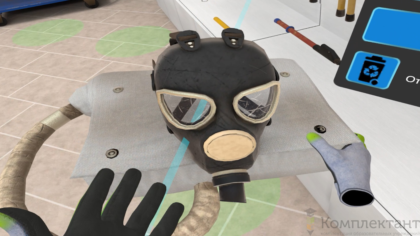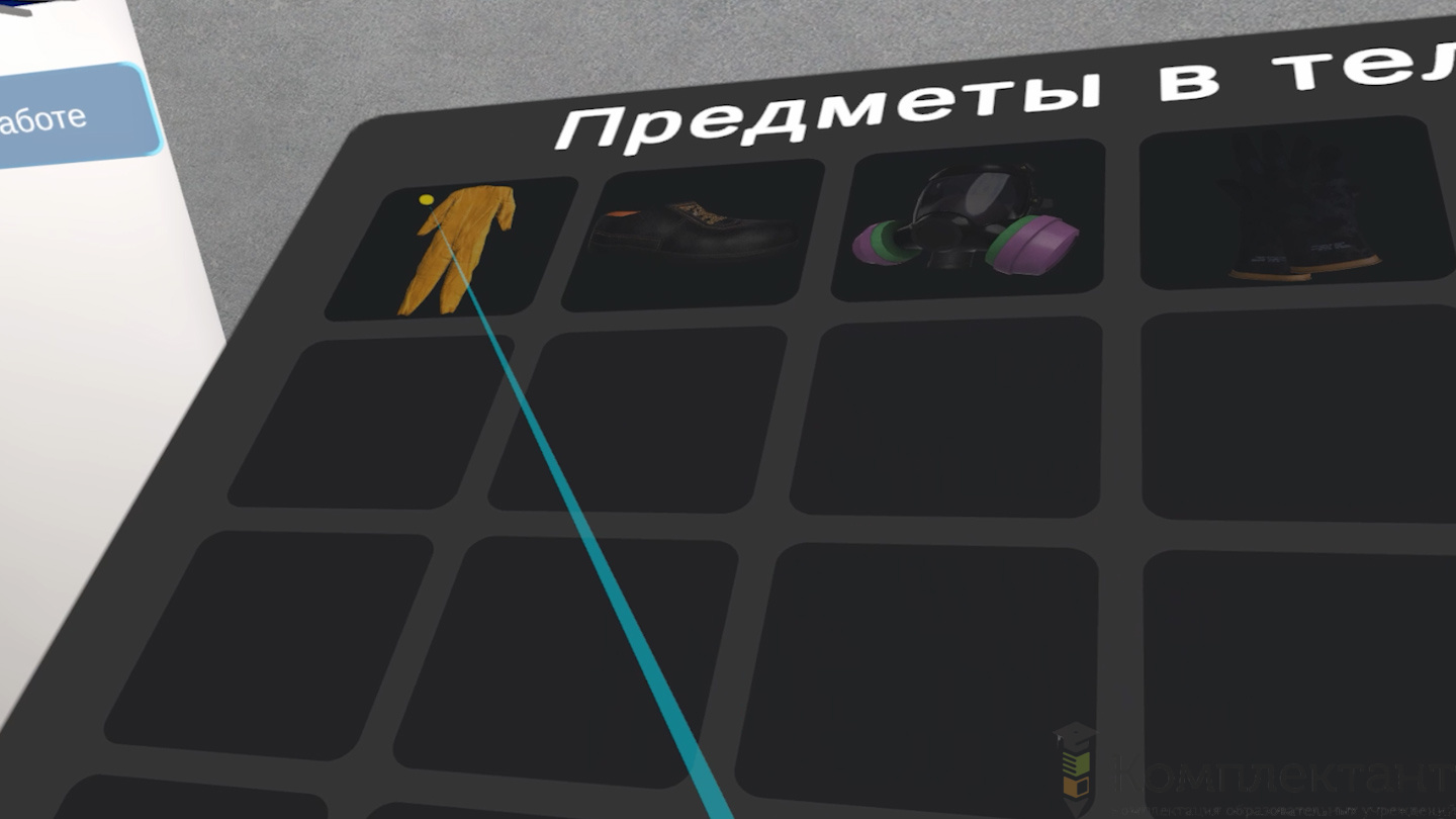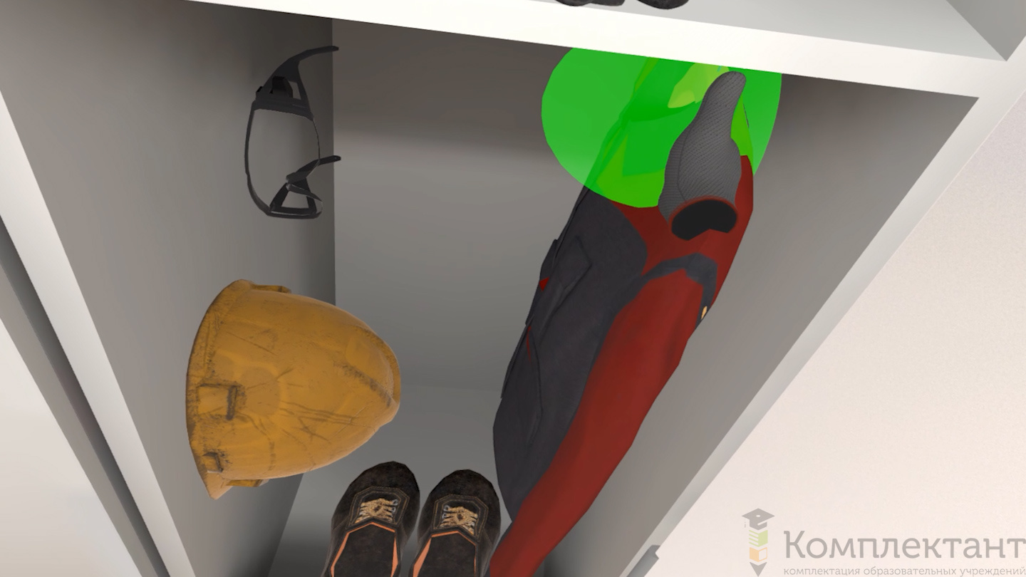 Виртуальный (VR) тренажер «Средства индивидуальной защиты» воссоздает ситуацию, в которой пользователю необходимо осуществить проверку основных СИЗ, отказ от поврежденных, понимать процесс проверки, разделить СИЗ на те, которые находятся на пользователе сейчас, и те, которые следует принести на рабочее место. СИЗ - это средства, которые нейтрализуют воздействия опасностей, вызывающие серьезные травмы и заболевания на рабочем месте. В рамках тренажера пользователю предоставляется выбор работ: химические и электрические, СИЗ меняются в зависимости от выбора.