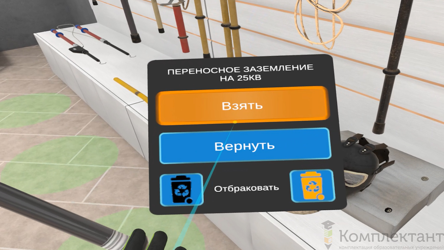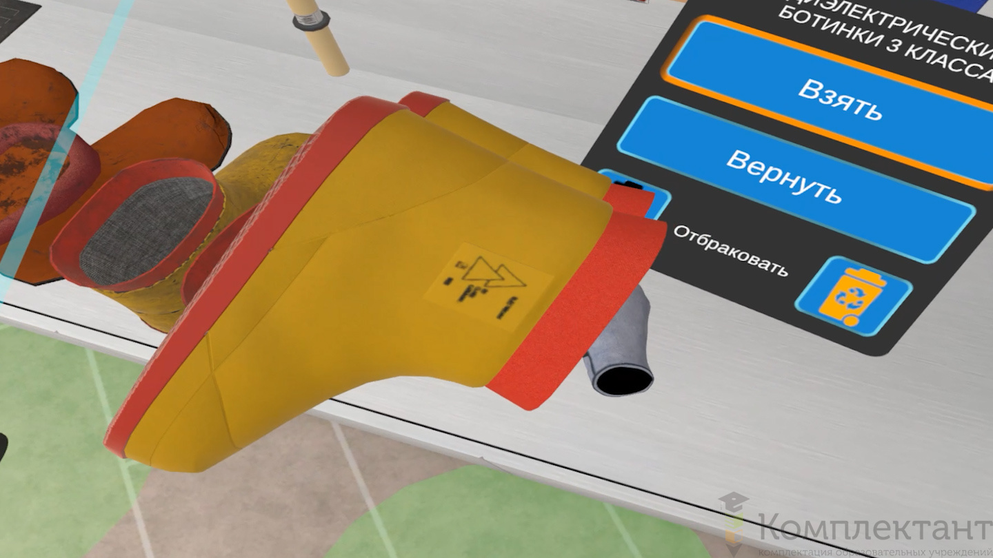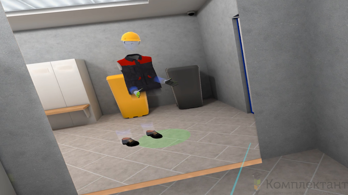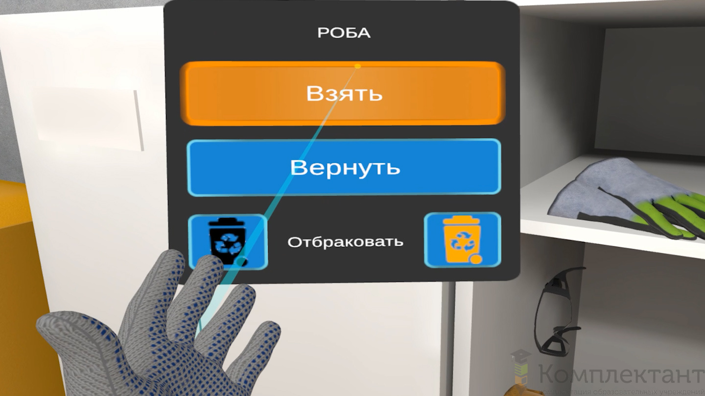 Виртуальный (VR) тренажер «Средства индивидуальной защиты» воссоздает ситуацию, в которой пользователю необходимо осуществить проверку основных СИЗ, отказ от поврежденных, понимать процесс проверки, разделить СИЗ на те, которые находятся на пользователе сейчас, и те, которые следует принести на рабочее место. СИЗ - это средства, которые нейтрализуют воздействия опасностей, вызывающие серьезные травмы и заболевания на рабочем месте. В рамках тренажера пользователю предоставляется выбор работ: химические и электрические, СИЗ меняются в зависимости от выбора.