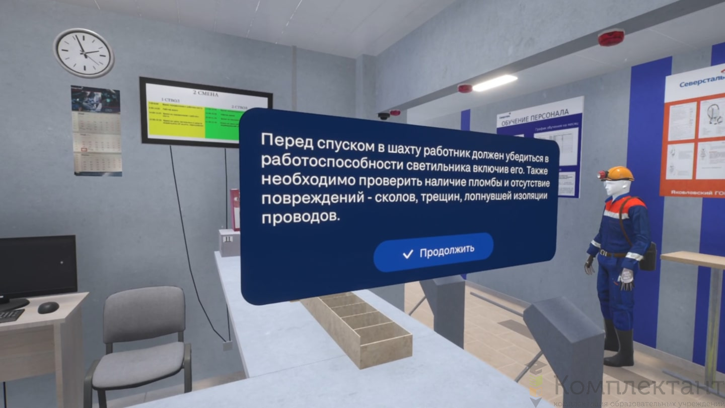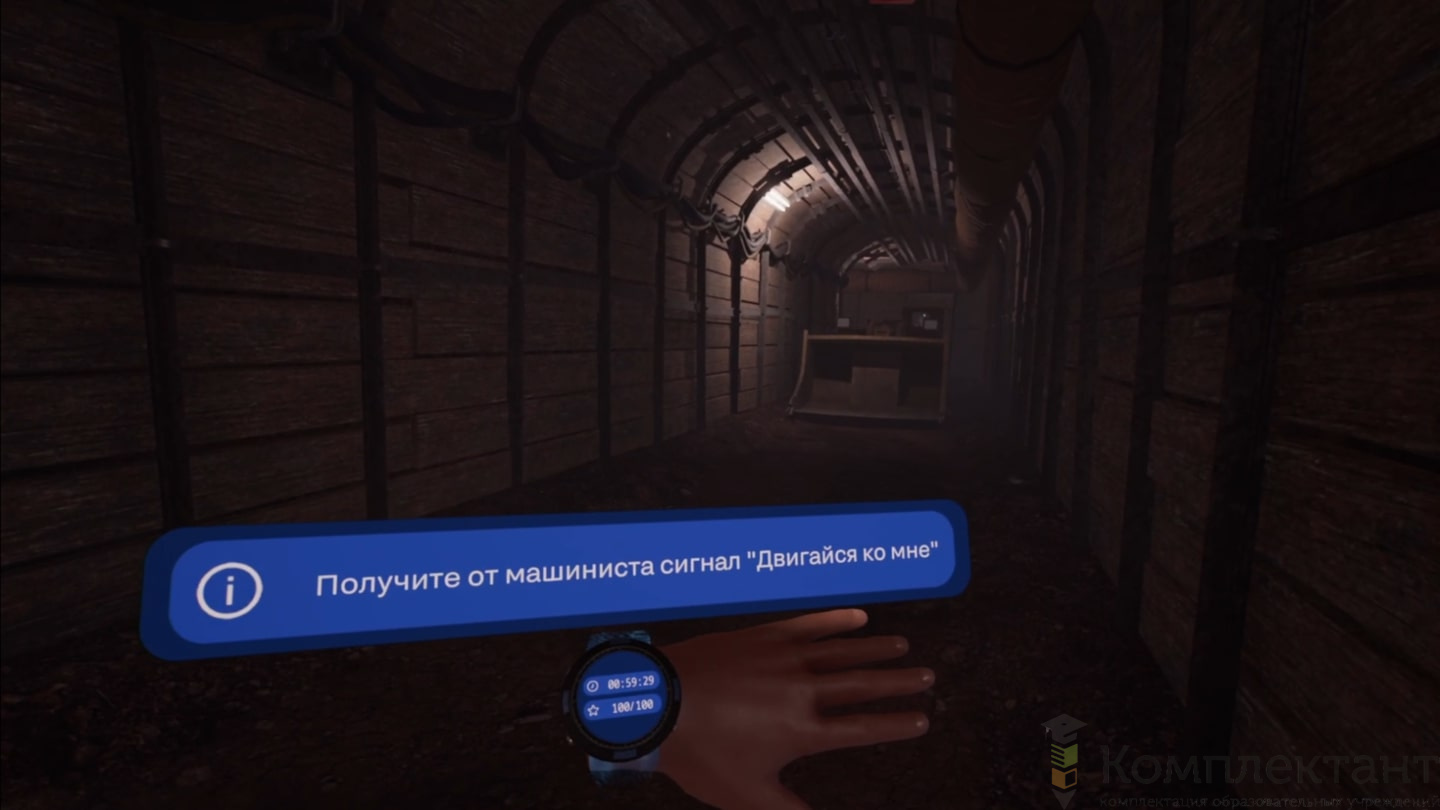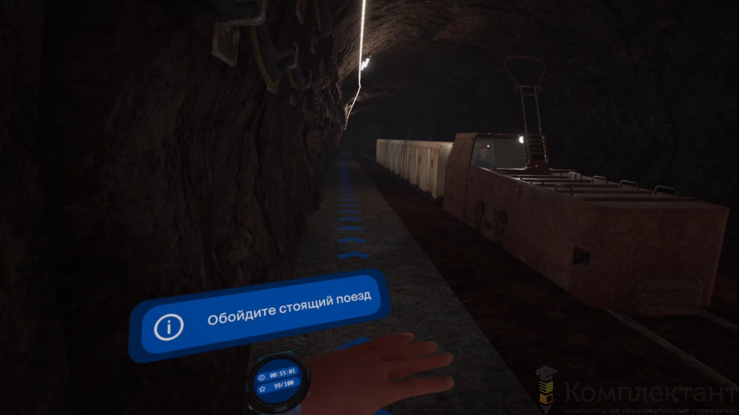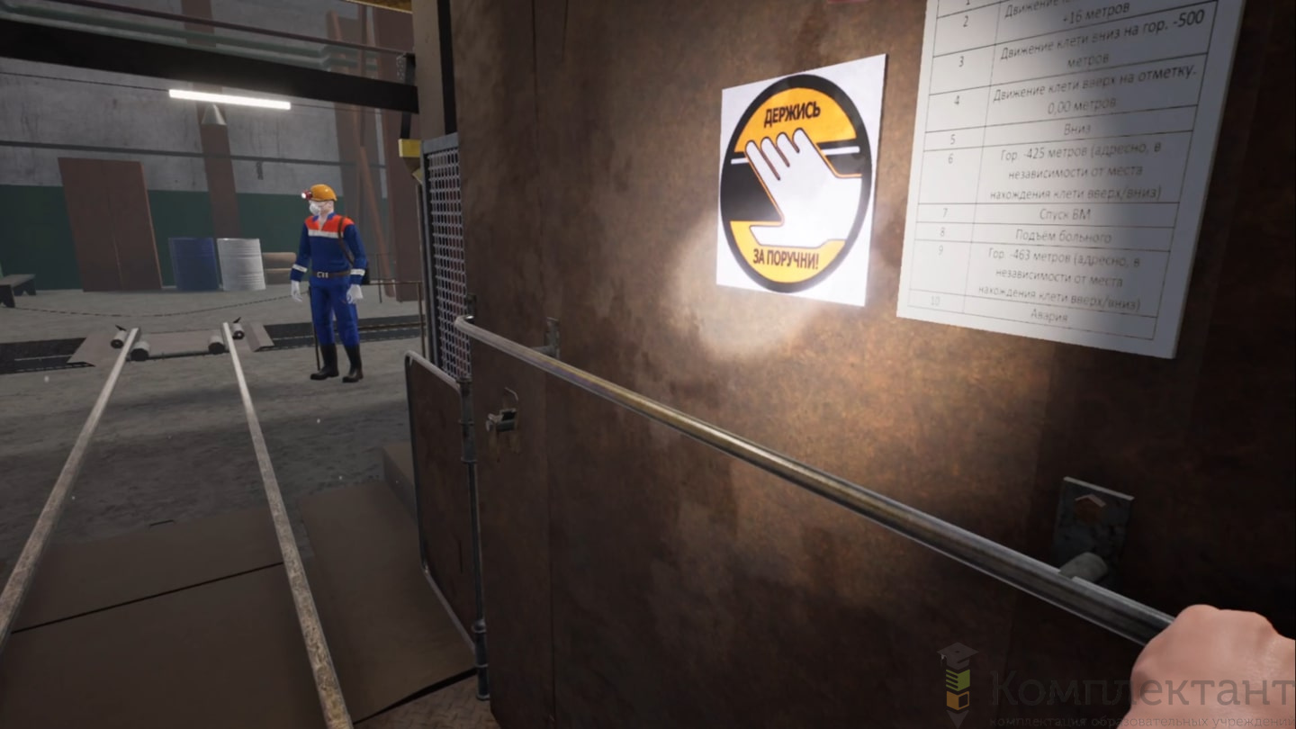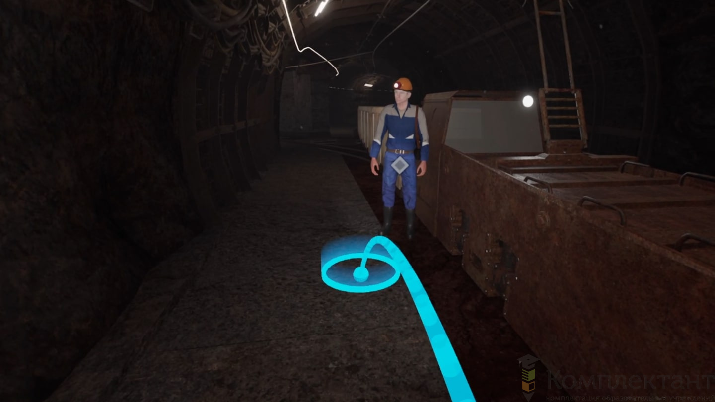 Тренажер «Безопасное поведение в подземном руднике» воссоздает ситуацию, в которой пользователь знакомится с основными правилами безопасного поведения в подземном руднике и формирует правильные модели поведения в нестандартных ситуациях, таких как заклинивание клети, оказание первой помощи пострадавшему, действия при задымлении. Доступен VR и ПК режим.