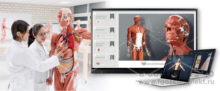 Комплекс предназначен для изучения анатомического строения мышечной системы тела человека с помощью голосового сопровождения и интерактивной указки, позволяющей пользователю взаимодействовать со программным обеспечением комплекса и выполнять учебные задачи. Входящая в состав комплекса анатомическая модель тела взрослого мужчины с мышцами и внутренними органами имеет высоту 80 см и состоит из 27 съемных частей с нанесёнными метками для считывания специализированной указкой.