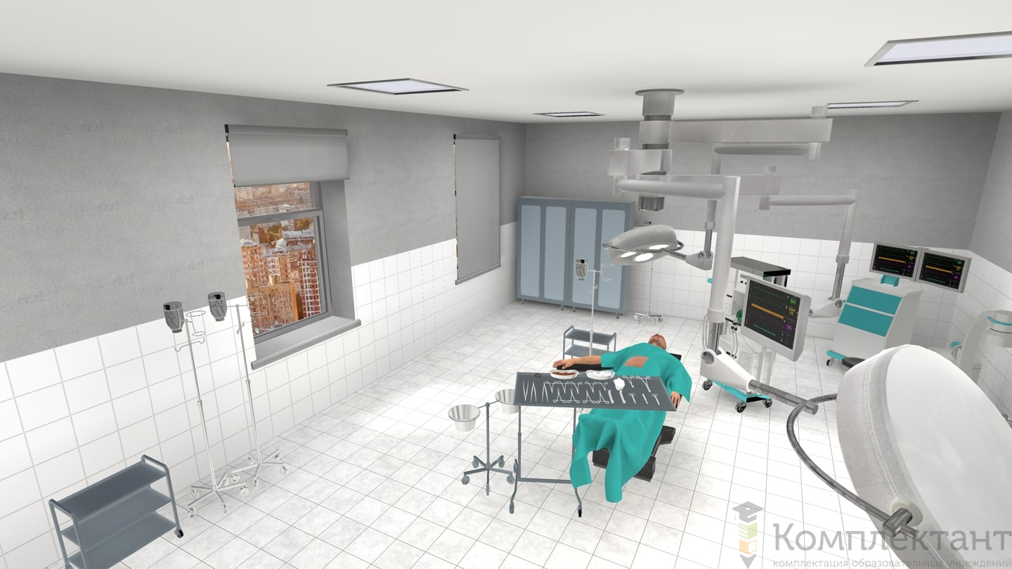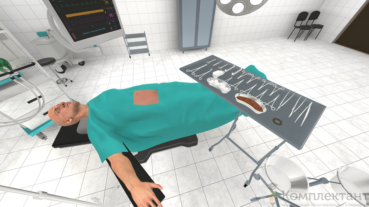 Виртуальный (VR) тренажер «Хирургическая операция Аппендэктомия» – детальная симуляция операции по вырезанию аппендицита. Проведение аппендэктомии требует помощи ассистентов. В приложении роль ассистентов выполняют виртуальные руки, выполняющие вспомогательные действия, например, придержать инструмент, убрать инструменты, сброс мусора в урну.