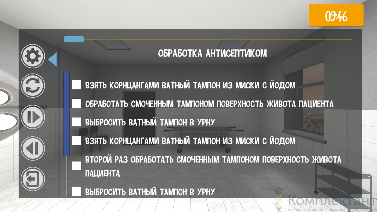 В начале тренировки пользователю предстоит обработать рабочую поверхность пациента — его живот, затем надо рассечь кожу, подкожную клетчатку и апоневроз с помощью скальпеля, расширив рану крючками Фарабефа. Дальнейшими действиями пользователя выступают: извлечение аппендикса, отсечение брыжейки аппендикс, перевязки, наложение швов, удаление аппендикса, вправление слепой кишки и ушивание.