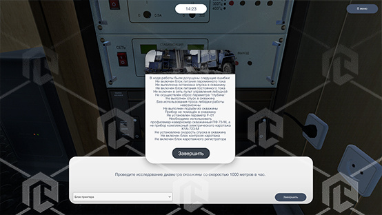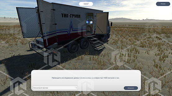 Специализированное программное обеспечение программного модуля геология нефти и газа, в котором реализованы трехмерные модели оборудования и пульты управления мобильной каротажной станции. Позволяет наглядно отображать и изучать оборудование мобильной каротажной станции и принцип ее работы. В программе реализовано обучение и проверка знаний в виде контрольного задания по геофизическому исследованию скважины.